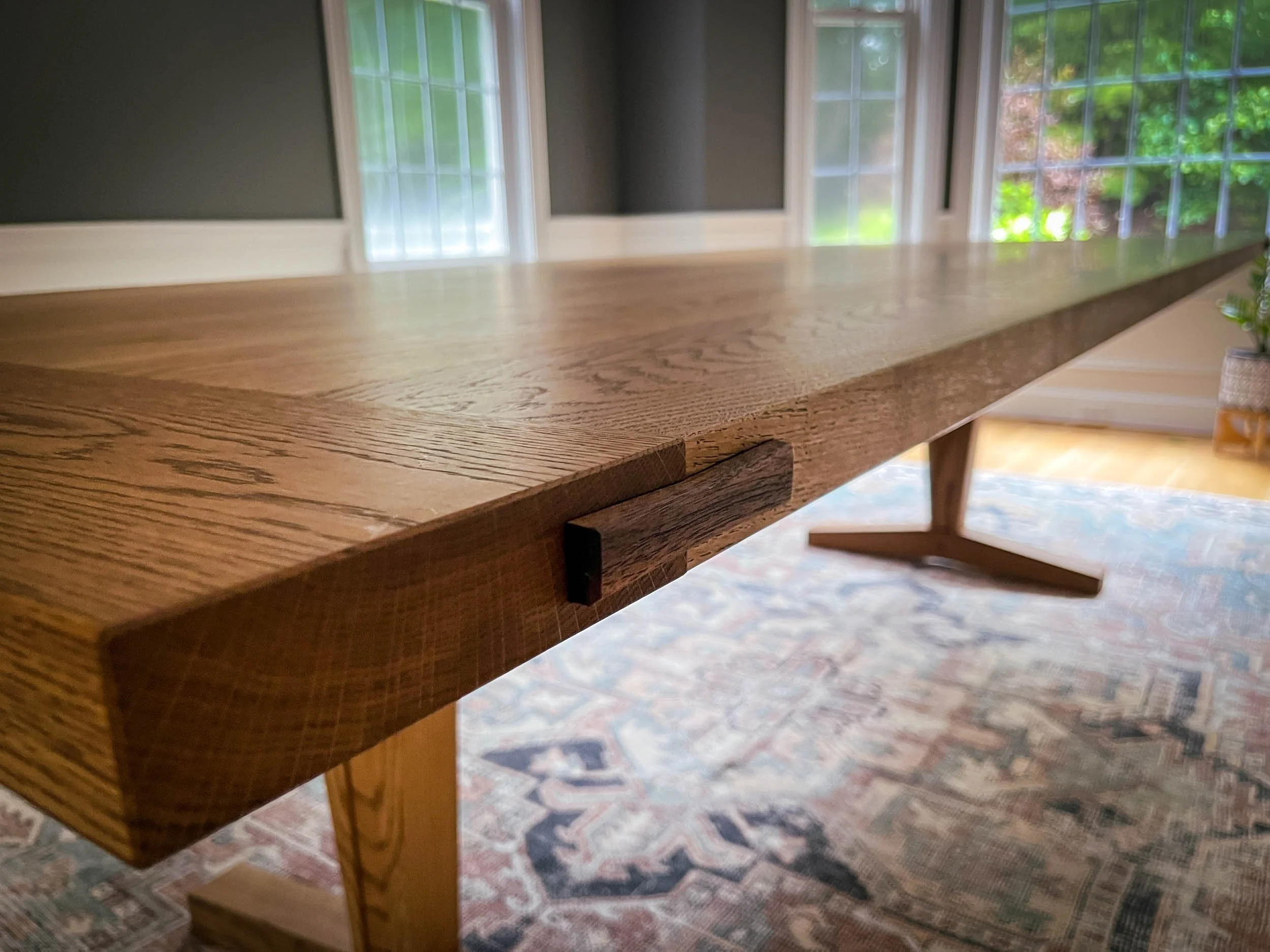 The Moore Table is a solid white oak dining table crafted for a private residence. This piece features pinned breadboards and dovetail details on the table's edge. Finished with Rubio Monocoat.